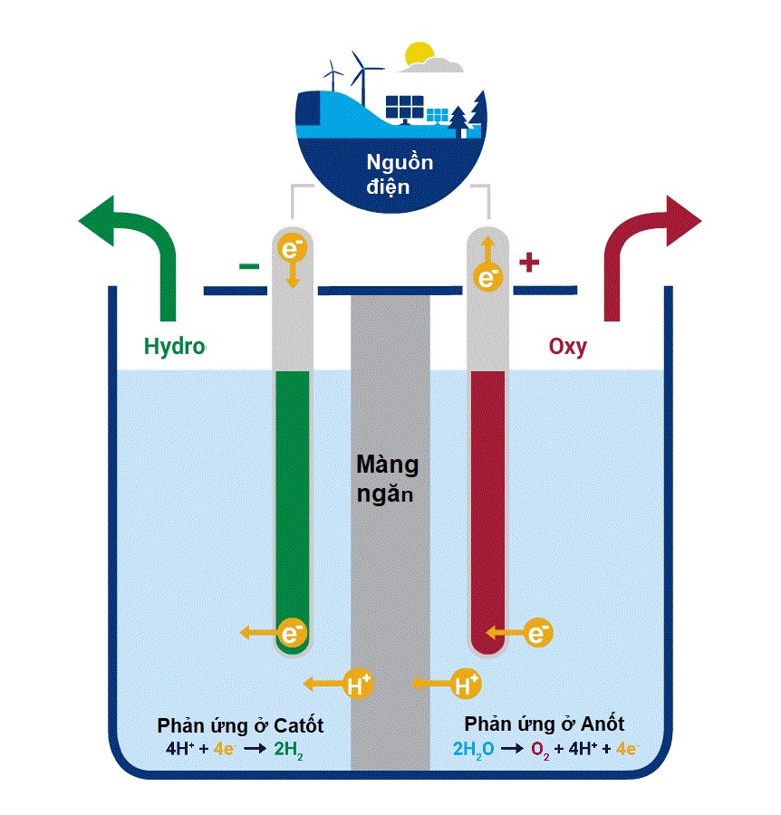 “Hydro xanh” là hydro được sản xuất nhờ vào quá trình điện phân nước bằng năng lượng tái tạo, không gây phát thải khí CO2 vào môi trường. Điện phân là quá trình sử dụng điện để tách nước thành khí hydro và khí oxy trong một thiết bị được gọi là máy điện phân. Cũng giống như pin nhiên liệu, máy điện phân gồm có hai cực Anốt (cực dương) và Catốt (cực âm) được nhúng trong chất điện phân. Tùy vào loại chất điện phân được sử dụng, máy điện phân được chia thành 3 loại: máy điện phân có màng ngăn polyme (PEM Electrolyzer), máy điện phân kiềm (Alkaline Electrolyzer) và máy điện phân oxit rắn (Solid Oxide Electrolyzer).