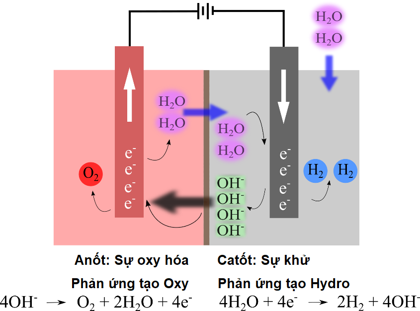 Hình 2. Nguyên lý hoạt động của máy điện phân kiềm: ion OH- di chuyển qua chất điện phân từ cực âm đến cực dương (Nguồn: Internet)