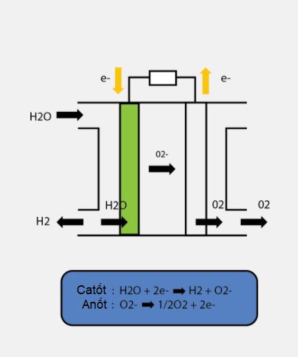 Hình 3. Nguyên lý hoạt động của máy điện phân oxit rắn: ion O2- được dẫn từ cực âm sang cực dương ở nhiệt độ cao (Nguồn: Internet)