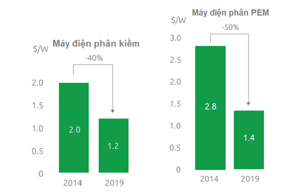 Giá bán máy điện phân kiềm ở Bắc Mỹ và Châu Âu giảm 40% từ năm 2014 đến năm 2019 là một ví dụ cho xu hướng này (3). Cũng trong giai đoạn 2014-2019, máy điện phân PEM do các nước phương Tây sản xuất ghi nhận sự giảm giá bán xuống còn 50% (từ 2.8 USD/W xuống 1.4 USD/W)(3).