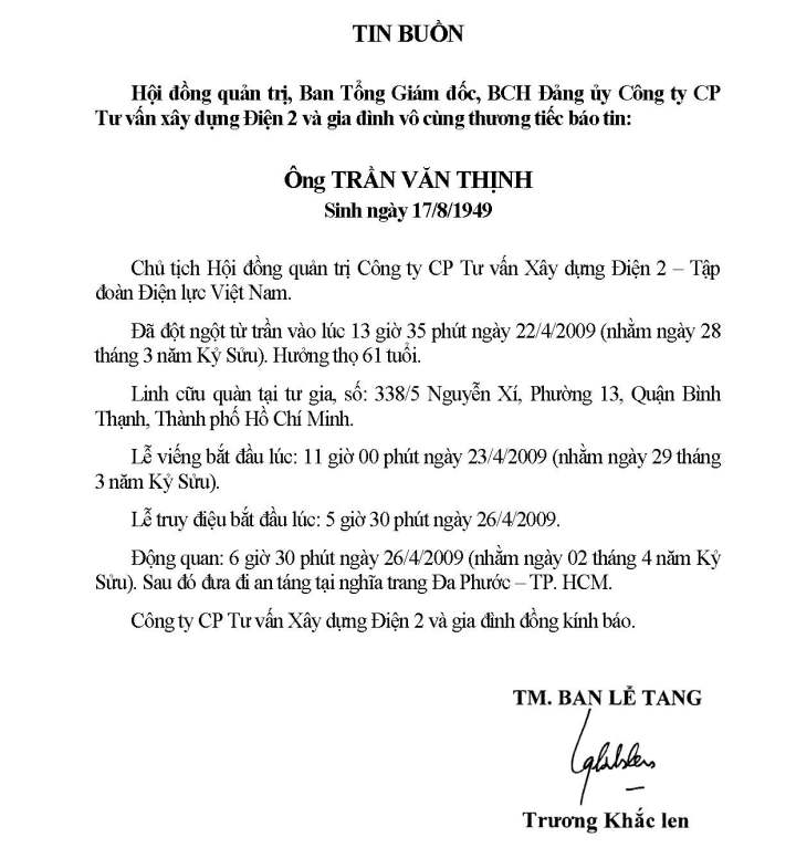 Tin buồn: Tập đoàn Điện lực Việt nam, Đảng ủy, Hội đồng quản trị, Ban Tổng Giám đốc Công ty CP Tư vấn Xây dựng Điện 2 và gia đình vô cùng thương tiếc báo tin