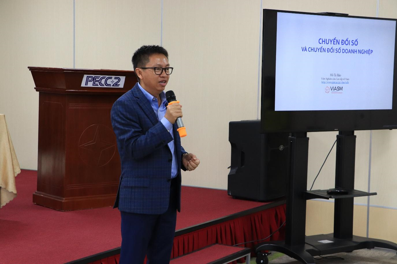 Tại buổi hội thảo, GS Hồ Tú Bảo đã giới thiệu về khái niệm Chuyển đổi số và Cách mạng công nghiệp lần thứ tư với các cấp độ từ số hóa thông tin, khai thác cơ hội số và chuyển đổi; các khái niệm như số hóa, kinh tế số, nền tảng số. GS Bảo cũng đã đưa ra rất nhiều dẫn chứng về quá trình chuyển đổi số ở các doanh nghiệp lớn trên thế giới cũng như ứng dụng của công nghệ số vào các lĩnh vực khác nhau của đời sống xã hội. Đồng thời, ông cũng đưa ra một số ý kiến và định hướng cho kế hoạch nâng cao năng lực số của PECC2.