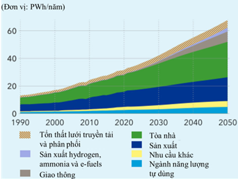 Nhu cầu điện toàn cầu dự kiến sẽ tăng từ 33 PWh (nghìn tỷ kWh) lên 68 PWh vào năm 2050, chủ yếu do nhu cầu ngày càng tăng đối với các ứng dụng hiện có, cũng như các loại phụ tải mới. Sự điện khí hóa giao thông, với 75% số lượng xe toàn cầu sẽ là xe điện, sẽ tăng thêm 7 PWh nhu cầu tiêu thụ mới. Các thiết bị điện phân kết nối với lưới sẽ tiêu thụ 3,4 PWh/năm để cung cấp hydrogen xanh.