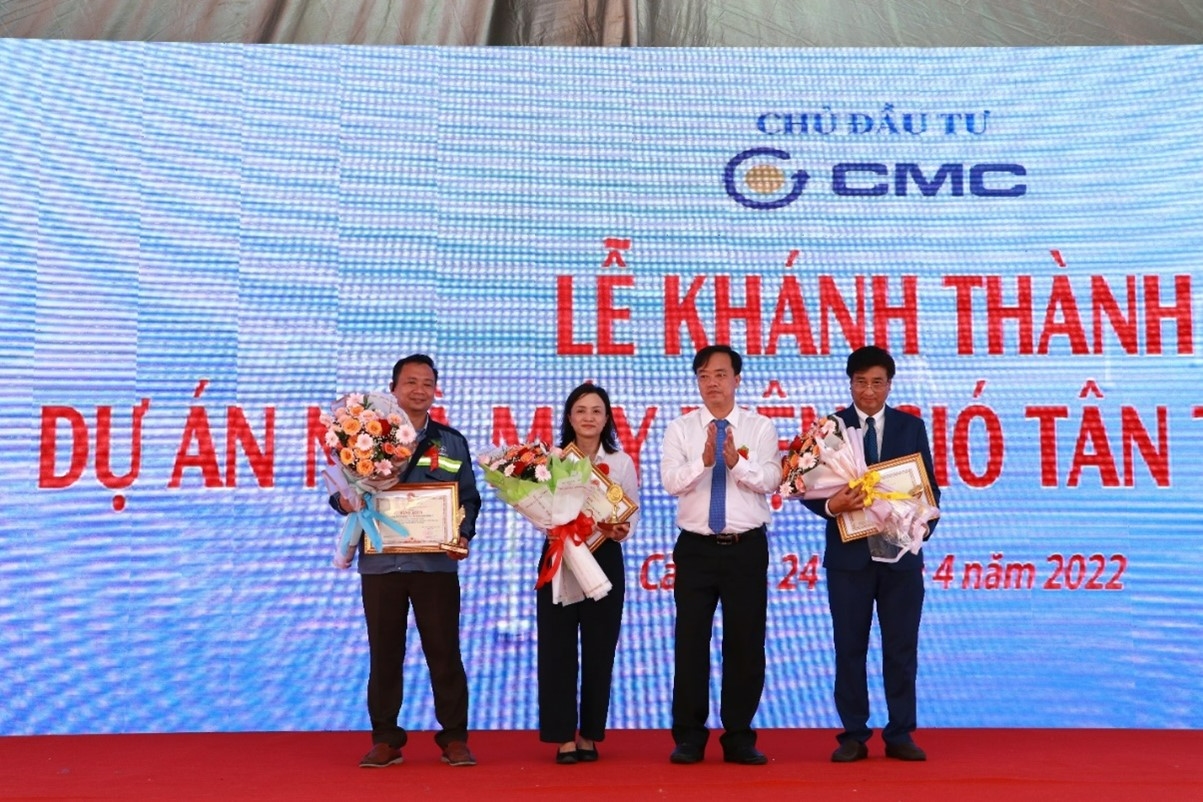 Lãnh đạo UBND Tỉnh Cà Mau trao tặng bằng khen và kỷ niệm chương cho các tập thể và cá nhân đã có những đóng góp trong quá trình xây dựng Nhà máy điện gió Tân Thuận (Từ trái qua: Ông Võ Văn Bình – Tổng Giám đốc PECC2, Bà Nguyễn Thị Hương Giang – Phó Giám đốc CMC, Ông Vũ Hùng Hải – Giám đốc CMC).