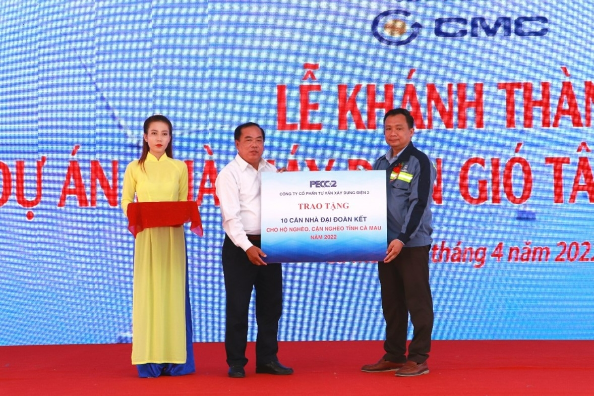 Tại buổi lễ, Tổng thầu PECC2 đã trao tặng 10 căn nhà đại đoàn kết đến các hộ nghèo và cận nghèo tại Tỉnh Cà Mau, đồng hành cùng công tác an sinh – xã hội tại địa phương. Bên cạnh đó, Lãnh đạo UBND Tỉnh Cà Mau cũng đã tiến hành trao tặng bằng khen và kỷ niệm chương cho tập thể Tổng thầu EPC PECC2 ghi nhận những đóng góp trong quá trình xây dựng Nhà máy điện gió Tân Thuận nói riêng và sự phát triển của Tỉnh Cà Mau nói chung.