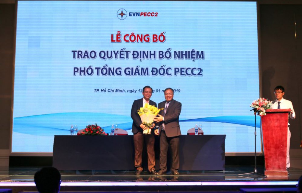 Ông Đinh Quang Tri – Phó Tổng Giám đốc EVN trao Quyết định và tặng hoa chúc mừng ông Võ Văn Bình được bổ nhiệm Phó Tổng Giám đốc PECC2