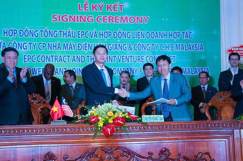 Vào 9h00 sáng ngày 25/9/2013, tại Hội trường chính trụ sở UBND tỉnh Hậu Giang, đã diễn ra Lễ ký kết ba hợp đồng giữa Chủ Đầu tư và các bên đối tác để chuẩn bị cho việc xây dựng Nhà máy nhiệt điện Trấu Hậu Giang, dự kiến khởi công vào cuối năm 2013 nhân dịp 10 năm kỷ niệm ngày thành lập tỉnh Hậu Giang. Các hợp đồng bao gồm: Hợp đồng tổng thầu EPC; Hợp đồng liên doanh hợp tác giữa Công ty CP Nhà máy Điện Hậu Giang (HGPP) và Công ty C.H.E Malaysia; Và Hợp đồng tư vấn giám sát giữa HGPP và Công ty CP Tư vấn Xây dựng Điện 2 (PECC2).